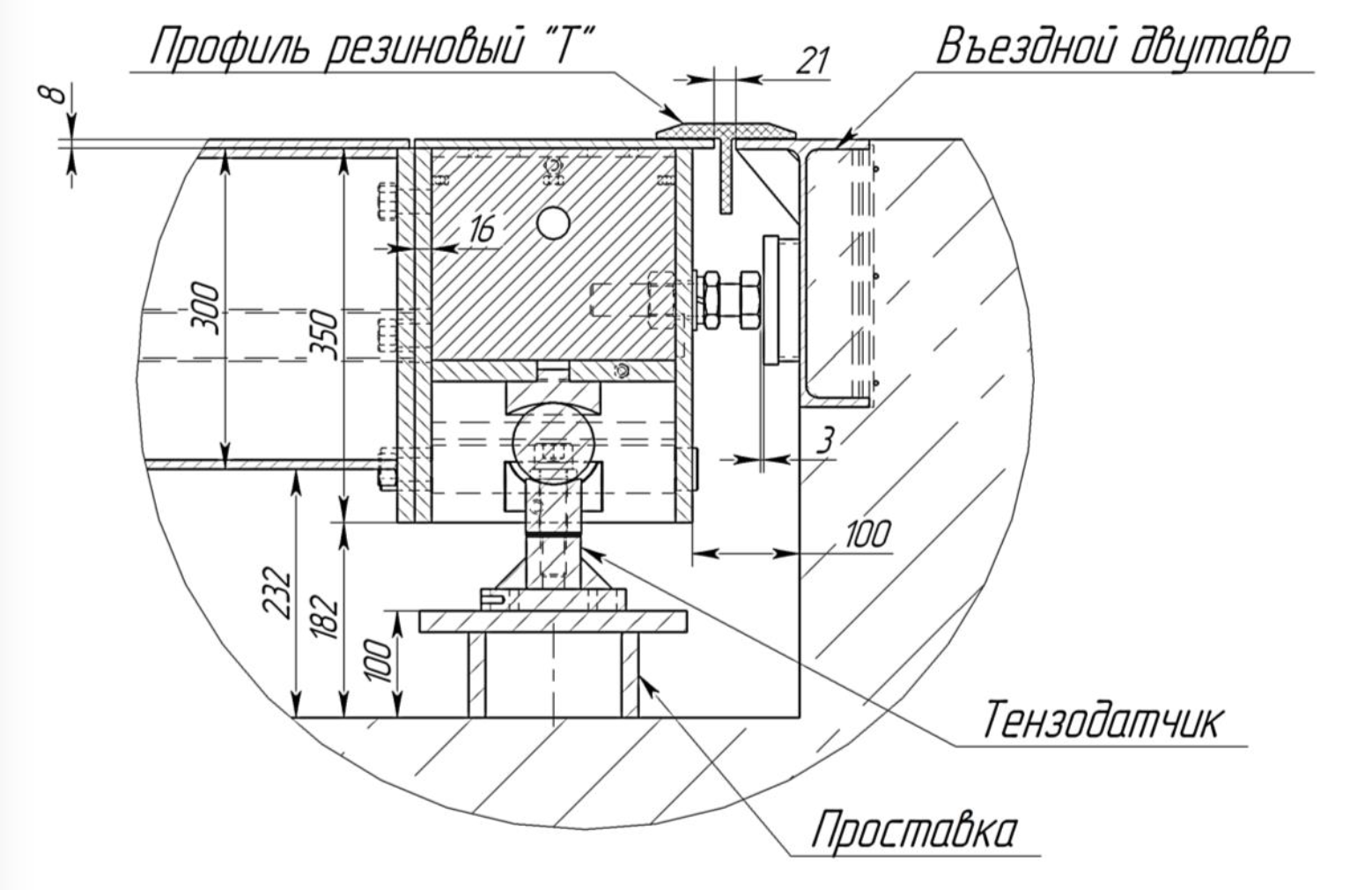 В типовых фундаментах для весов ВЕСТА это расстояние составляет 50…70мм (кромка пандуса обрамлена уголком 75х75х5), но в условиях сильного загрязнения необходимо увеличить это расстояние. Просто отодвинуть пандусы нельзя, т.к. необходимо обеспечить нормальную работу продольных упоров и размещение «Т»-образного грязезащитного резинового профиля (Рисунок 3). Въездной двутавр решает эти задачи, а также обладает гораздо более высокой стойкостью к нагрузкам со стороны колес, чем типовой уголок 75х75х5. Также въездные двутавры могут быть дополнительно адаптированы под реализацию системы подогрева «Горыныч»